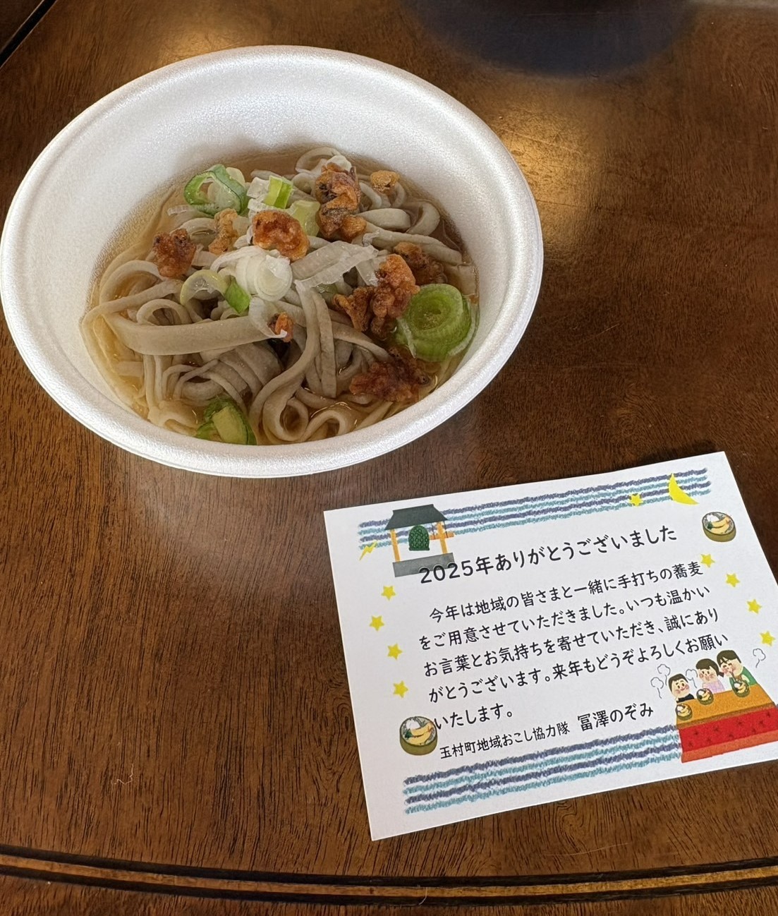 12月26日(金)、重田家住宅の年内最後の開館日に合わせて地域おこし協力隊の冨澤さんによる「年越しそば企画」が行われました。今回は火雷そばの会の皆さんにご協力いただき、今年お世話になった皆さんへ手打ちそばを振る舞いました。冨澤さんは「色んな方に出会い、学んだ1年でした。火雷そばの会の皆さんと一緒に蕎麦打ちをし、皆さんに食べていただきながらご挨拶ができて感謝の気持ちでいっぱいです。」と話していました。