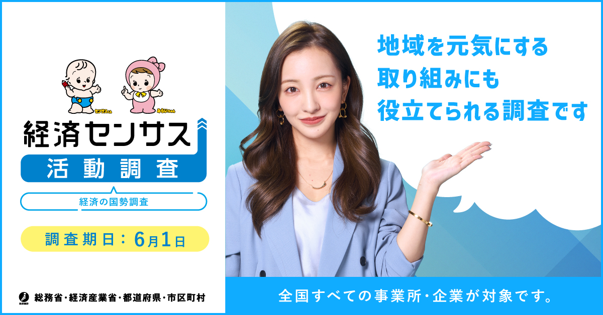「経済センサス‐活動調査」は、”経済の国勢調査”とも言われ、5年に一度、全国すべての事業所および企業(個人事業主を含む)を対象に実施されます。調査へのご協力をよろしくお願いします。