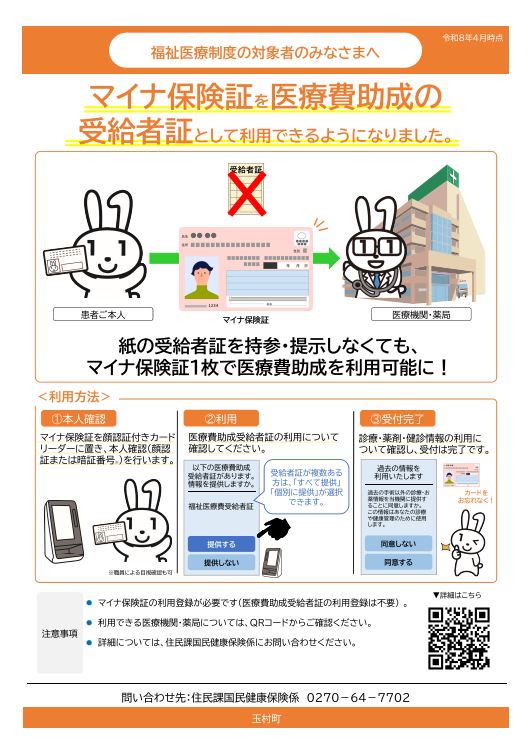 玉村町が発行する『福祉医療費受給資格者証』(子ども・ひとり親・障がい者資格)をお持ちの方で、マイナンバーカードを保険証として利用登録されている方
