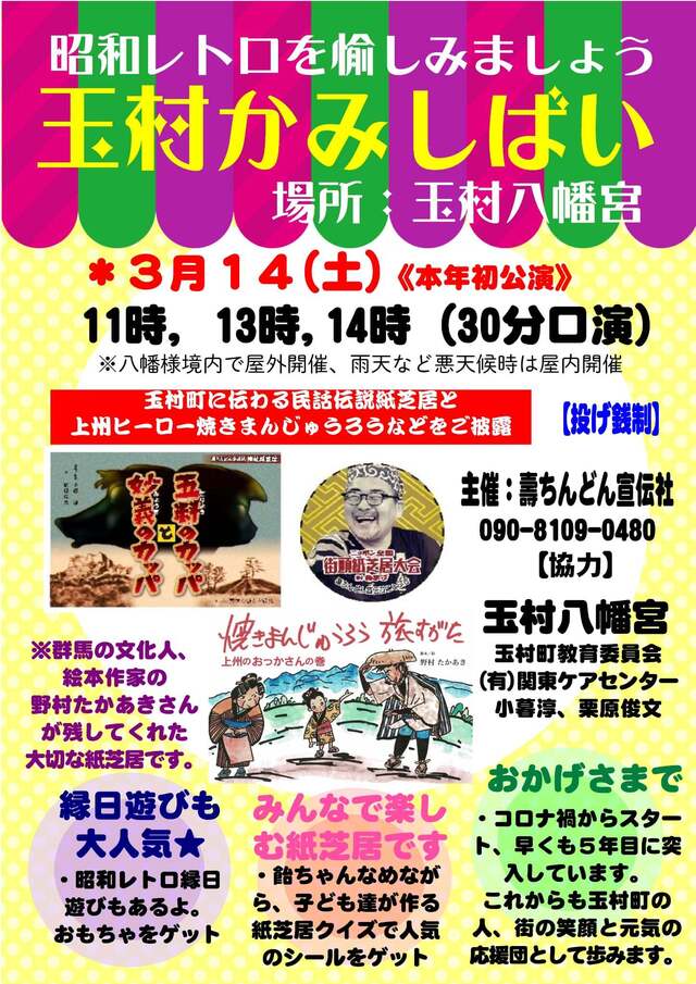 公開日 2026年02月17日 玉村八幡様に紙芝居がやってくる! 主催・お問合せは 壽ちんどん宣伝社 電話090-8109-0480 この記事に関するお問い合わせ 企画課住所:〒370-1192 群馬県佐波郡玉村町大字下新田201TEL:0270-64-7711FAX:0270-65-2592
