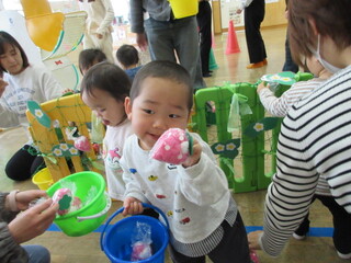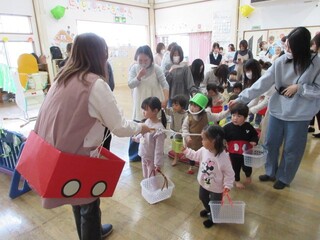 今月は「いちご狩りごっこ」ということで、みんなでお花紙でいちごを作り、バスにのっていちご畑へ。いちごをたくさん収穫して遊びました(*^^*)